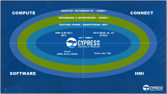 连接技术是计算核心的另一个助手。在IoT时代,强大的无线/有线连接技术是各种网络的基础。赛普拉斯的低功耗蓝牙技术已经非常出色,加上2016年收购的博通IoT业务,又在Wi-Fi领域具备了强大的竞争力。