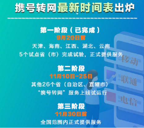 据悉,携号转网工作推进将分为三个阶段:9月20日前,天津市、海南省、江西省、湖北省、云南省5个试点省(市)完成试验,正式提供服务;11月10日至25日,其他26个省(自治区、直辖市)“携号转网”服务上线试运行;11月30日前,全国范围内正式提供服务。(校对/holly)