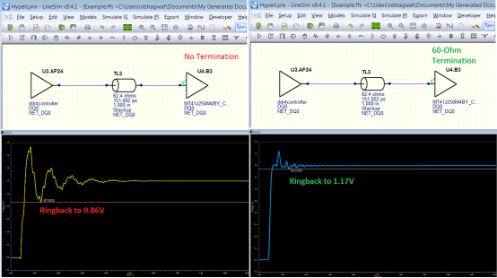 下面我们来看一个示例。如果设计人员或工程师准备将一个发射器连接到某个一定距离外的未端接接收器,结果将与图 1 显示的波形类似。在这里,我们可以看到振铃和过冲两种违规。该波形显示,1.2V 信号上存在超过 1.75V 的过冲,这可能导致零件过早失效。它还产生了 0.86V 的振铃,根据具体设置,这可能导致 DDR4 出现逻辑故障。如果 PCB 内置有这一拓扑,数据流中就会发生错误,进而可能损坏接收器。