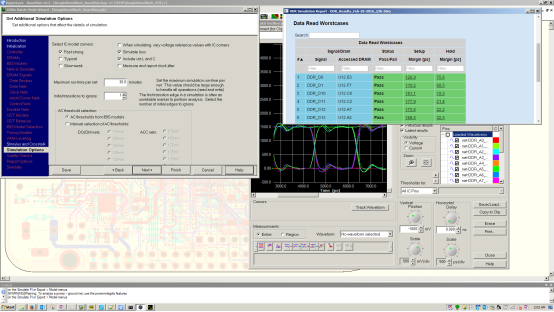 设置过程非常轻松,向导会提示设置仿真所需的全部问题。用户可回答相关的信息,包括选择用于控制器和存储器件的 IBIS 模型、读/写周期的驱动强度值、片内终端匹配器 (ODT),以及字节通道/Strobe/ 掩膜分配等。可以保存向导配置并重新调用以便将来使用,从而节省未来项目中的量产爬坡时间。仿真可在 Layout 之前或之后运行,从而帮助定义 Layout 要求以及在完成 Layout 之后对其进行验证。