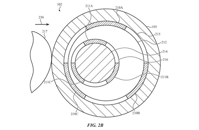 专利显示,数字表冠可以从沿多个方向移动的盖或杆上创建,并覆以2个表面上的电容元件,其中一个表面在另一个表面内旋转和移动,例如插槽或环内的轴。通过检测每个电容元件的电容变化,即元件接触的位置,可以确定内部元件相对于外部元件的物理位置。因此,这将告知设备用户将表冠按入哪个方向。