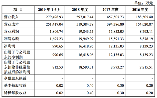 报告期内,2016年-2019年上半年,迪芬尼声学实现营收分别为188,505.40万元、457,507.73万元、597,017.44万元、279,498.93万元;相对应的净利润分别为8,139.23万元、12,135.03万元、16,418.96万元、990.65万元。