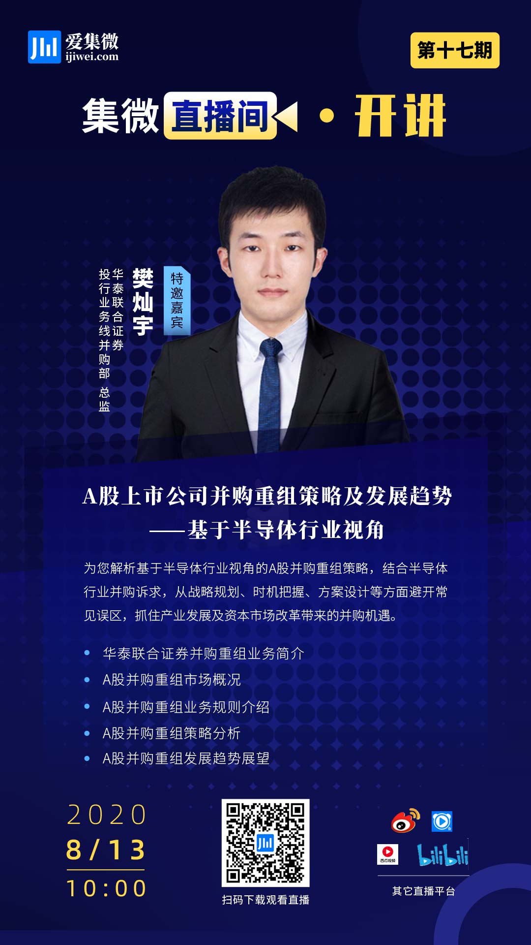 为了助力A股半导体企业了解并购潮下的策略,以及如何避开误区、把握机遇,8月13日(周四)10:00,集微网邀请华泰联合证券投行业务线并购部总监樊灿宇做客第十七期“开讲”,带来以《A股上市公司并购重组策略及发展趋势——基于半导体行业视角》为主题的精彩演讲,为你解析基于半导体行业视角的A股并购重组策略,结合半导体行业并购诉求,从战略规划、时机把握、方案设计等方面避开常见误区,抓住产业发展及资本市场改革带来的并购机遇。