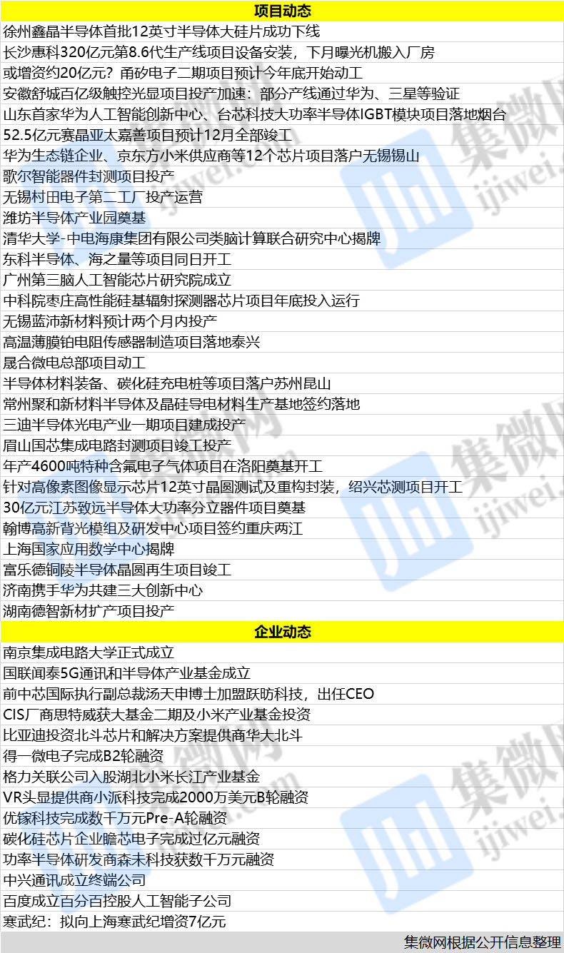 本周,徐州鑫晶半导体首批12英寸半导体大硅片成功下线,长沙惠科320亿元第8.6代生产线项目设备安装,CIS厂商思特威获大基金二期及小米产业基金投资,南京集成电路大学正式成立……