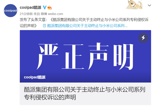集微网11月10日消息,今天,coolpad 酷派官方微博发布声明,决定即日起主动终止与小米的系列专利诉讼,撤销正在进行中的相关案件。