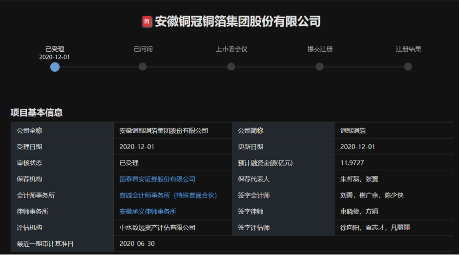 12月1日晚间,深交所正式受理安徽铜冠铜箔集团股份有限公司(铜冠铜箔)的创业板IPO申请。