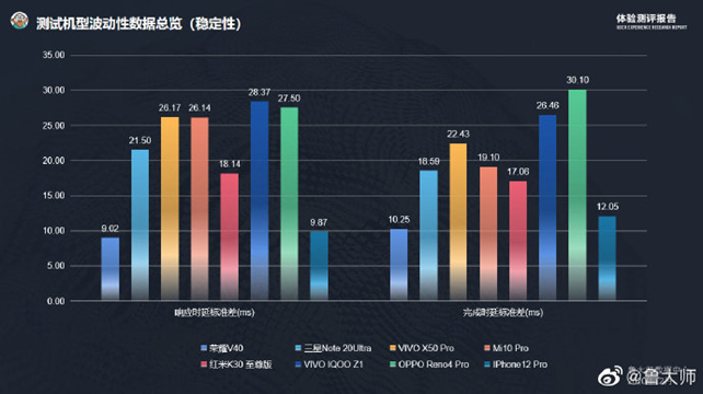 最后是鲁大师实验室动效测试,第一期的测试机型为荣耀V40、Redmi K30至尊纪念版、OPPO Reno4 Pro、三星Note20 Ultra、vivo X50 Pro、vivo iQOO Z1、小米10 Pro、iPhone12 Pro 。