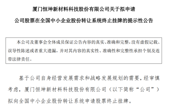 2月6日,据恒坤股份近期发布公告称,基于公司自身经营发展需求和战略发展规划的需要,经审慎考虑,厦门恒坤新材料科技股份有限公司拟向全国中小企业股份转让系统申请股票终止挂牌。