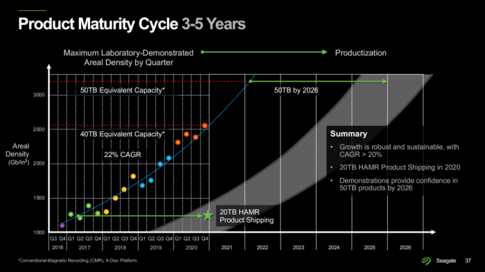 不过,想要制造出2600Gb/in2 (2.6Tb/in2) 密度的硬盘将需要三到五年的时间,才能为黄金时间做好准备,因为该公司仍需要打磨媒介技术,以及开发适当的磁头、硬盘机、控制器和其他电子组件。