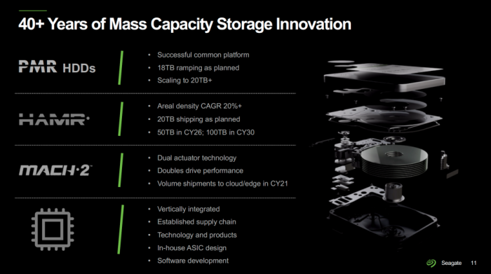 希捷表示,它正在按计划在2026年的某个时候制造50TB硬盘,并在2030年制造100TB硬盘。目前,希捷正在向选定的客户发售基于热辅助磁记录(HAMR)的3.5英寸20TB硬盘,并作为其Lyve存储系统的一部分。HAMR将使希捷能够以20%的年复合增长率(CAGR)提高其盘片的磁道密度,这意味着硬盘容量会向前迈出更大的步伐。