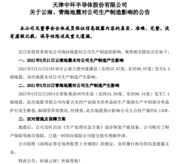 5月23日晚间,中环股份公告称,5月21日云南地震未对公司生产制造产生影响。不过5月22日青海地震导致其内蒙古光伏产业园光伏单晶硅生产基地生产中的部分单晶炉台发生断苞、焖埚等异常情况。经排查,此次地震预计影响中环股份5月份产量约0.13GW。