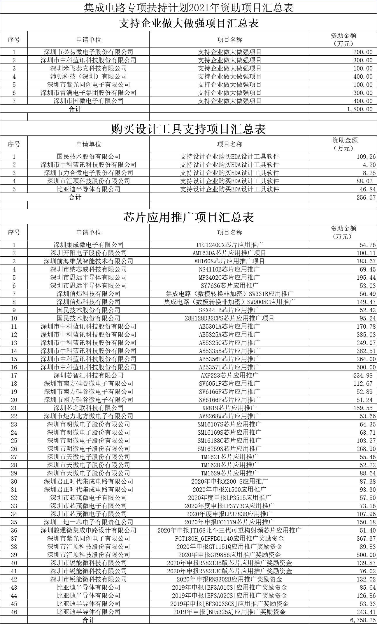 “芯片应用推广项目”共46个项目入选,包括深圳市纳芯威科技有限公司、深圳市思远半导体有限公司、深圳市中科蓝讯科技股份有限公司、深圳市明微电子股份有限公司、深圳市紫光同创电子有限公司、深圳市汇顶科技股份有限公司、比亚迪半导体有限公司等企业项目,资助金额合计6758.25万元。