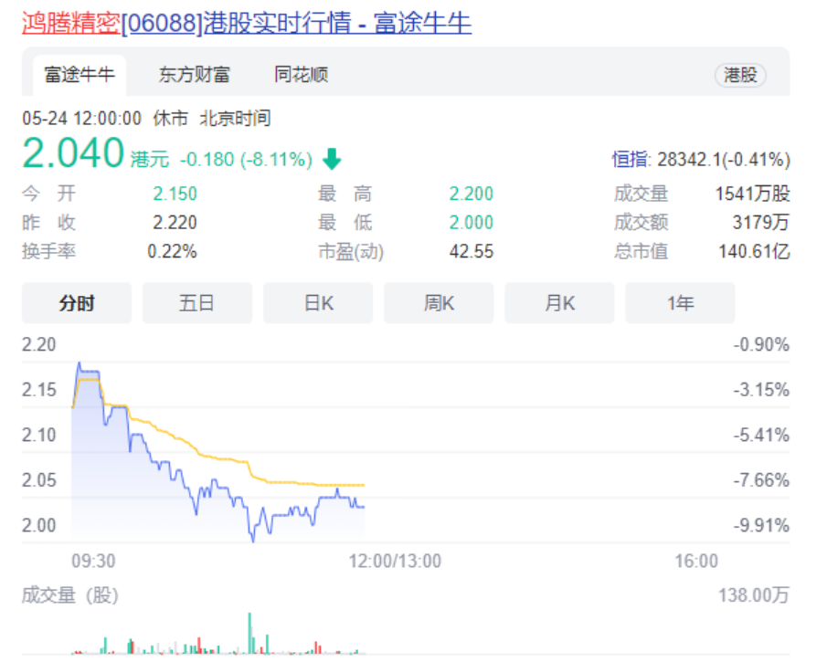 5月24日,鸿腾精密股价弱势震荡,截至发稿报2.040港元,跌幅8.11%,最新总市值140.61亿港元。