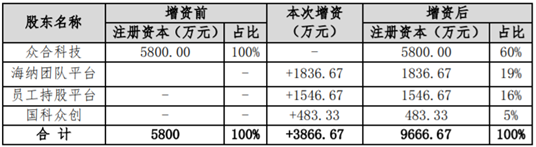 其中海纳团队平台计划增资4116.67万元,其中1836.67万元计入实收资本,2280万元计入资本公积;员工持股平台(筹)计划增资3466.67万元,其中1546.67万元计入实收资本,1920万元计入资本公积;国科众创计划增资人民币1083.33万元,其中483.33万元计入实收资本,600万元计入资本公积,共计增资款项为8666.67万元。
