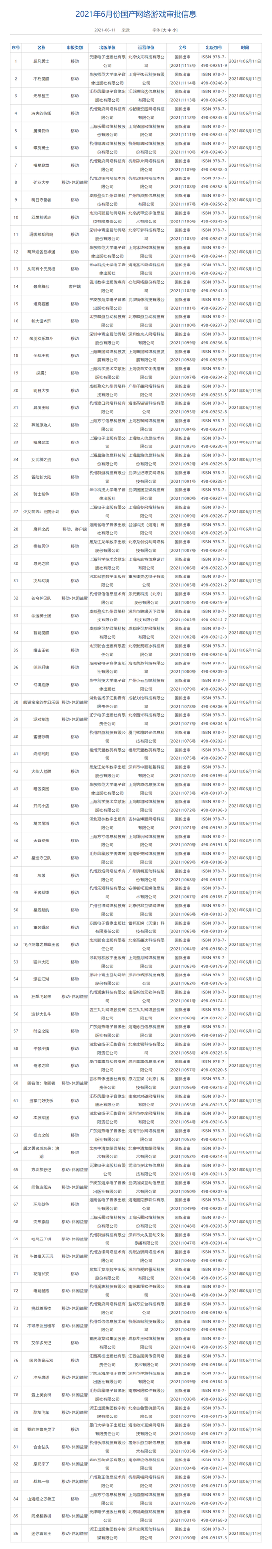 国家新闻出版署公布6月国产网络游戏审批信息 86款游戏在列 作者: 爱集微 2021-06-11 相关舆情 AI解读 生成海报 来源:新浪科技 #网络游戏# 评论 收藏 点赞 1.5w 新浪科技讯 北京时间6月11日晚间消息,国家新闻出版署公布6月国产网络游戏审批信息,电魂网络《螺旋勇士》、心动网络《最高舞台》等86款游戏在列。 责编: 爱集微 来源:新浪科技 #网络游戏# 收藏 点赞 分享至: 微信扫一扫分享 THE END 相关推荐 电子科技大学教授在管理学国际一流期刊Naval Research Logistics发表研究成果 罗永浩解释为何不做网游,因为违法 金山软件2016年第三季度营收同比增长近五成 第二季度网络游戏规模达416亿元 不止卖手机 小米互联网服务年入37亿 广电总局:网络游戏不得改编电视剧 +关注 爱集微 微信: 邮箱:laoyaoba@gmail.com 12.6w文章总数 12012.5w总浏览量 最近发布 【AI】马斯克:若没有AI和机器人 美国1000%会走向破产 3小时前 【引领】得一微:以AI存力引领端侧AI创新 智能手机存力主控出货突破1亿颗 3小时前 【头条】“2026国际集成电路创新博览会”会议论坛板块重磅升级!赋能产业高质量发展 3小时前 【淡出】台积电传全面淡出8英寸代工 世界先进接棒促双赢 3小时前 【裁员】四大知名品牌裁员;芯片巨头发涨价函,4月1日起生效 3小时前 获取更多内容 最新资讯 “芯片之母”EDA产业深度解析:IPO潮起,全栈化生态构建成破局关键 3小时前 得一微:以AI存力引领端侧AI创新 智能手机存力主控出货突破1亿颗 3小时前 “平台化”布局决胜2026,艾为电子穿越行业周期 3小时前 【AI】马斯克:若没有AI和机器人 美国1000%会走向破产 3小时前 【引领】得一微:以AI存力引领端侧AI创新 智能手机存力主控出货突破1亿颗 3小时前 【头条】“2026国际集成电路创新博览会”会议论坛板块重磅升级!赋能产业高质量发展 3小时前