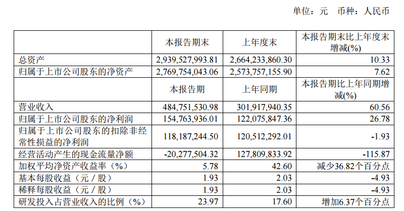思瑞浦8月4日晚间披露半年报,2021年上半年营业收入4.85亿元,同比增长60.56%;净利润1.55亿元,同比增长26.78%。基本每股收益1.93元。