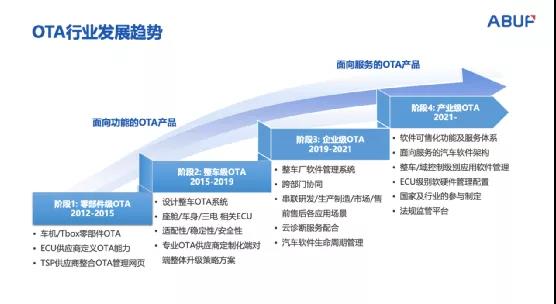 贺思聪在2020全球汽车产业峰会演讲中指出:根据艾拉比的行业观察,汽车OTA的行业发展趋势可以分成四个阶段:零部件级OTA、整车级OTA、企业级OTA和产业级OTA。