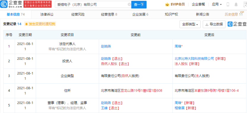 企查查信息显示,8月11日,爱镨电子(北京)有限公司发生工商变更,原股东均退出,新增股东北京比特大陆科技有限公司,持股100%。