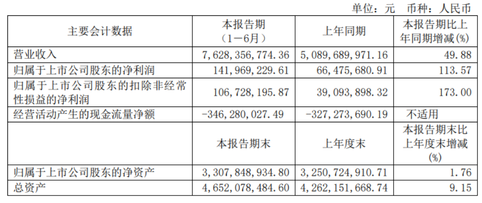 8月23日晚间,有研新材发布2021年半年报,上半年,公司实现营业收入76.28亿元,同比增长49.88%;归属母公司股东净利润1.42亿元,同比增长113.57%;归属于上市公司股东的扣除非经常性损益的净利润1.07亿元,同比大增173%;基本每股收益为0.168元。
