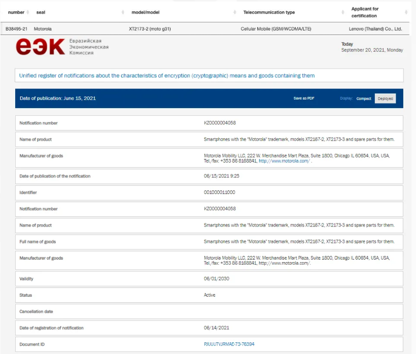 值得注意的是,这并不是摩托罗拉G31第一次被发现出现在不同的认证机构网站上。早些时候,摩托罗拉G31也曾出现在俄罗斯的EEC网站上,其中分配给该设备的型号被揭开。到现在为止,我们还没有发现摩托罗拉G31的任何进一步细节。然而,多点认证信息的出现可以认为该设备将很快面世。