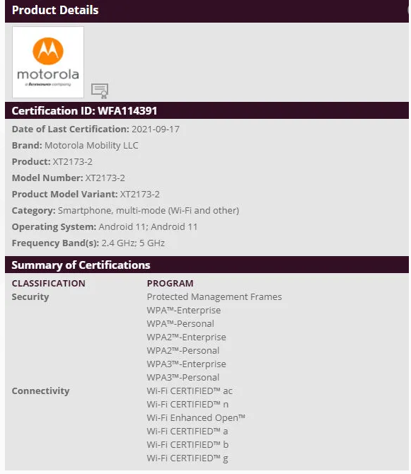 WiFi联盟认证网站还显示,新的摩托罗拉G31将开箱运行Android 11。该设备很可能运行的是Android 11的经典稳定版本,并进行了温和的优化,以实现一些摩托罗拉特有的软件功能。WiFi联盟认证网站上的列表还指出,该设备将支持双频Wi-Fi,即2.4GHz和5GHz。