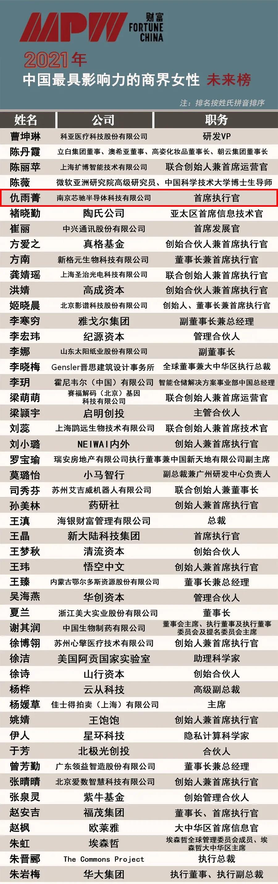 在今年入选该榜单的49名商界女性中,既有来自跨国企业的中方高层管理者、创投企业的创始人也有来自科技领域的科技女性高管。值得一提的是,在今年登上未来榜榜单的49位商界女性中,芯驰科技CEO仇雨菁是榜单中唯一一位芯片领域的上榜者。
