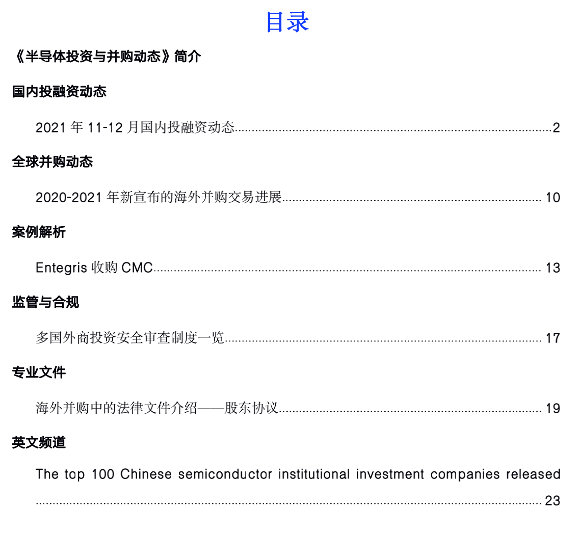 本期《半导体投资与并购动态》整理了11-12月份国内投融资动态,重点解读了Entegris收购CMC案并简要介绍了多国外商投资安全审查制度对比。