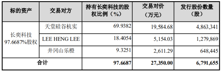 1月21日晚间,长川科技披露交易预案,公司拟通过发行股份向天堂硅谷杭实、Lee Heng Lee 及井冈山乐橙购买其合计持有的长奕科技 97.6687%股权,交易价暂定2.74亿元。本次交易完成后,长川科技将持有长奕科技100%股权。