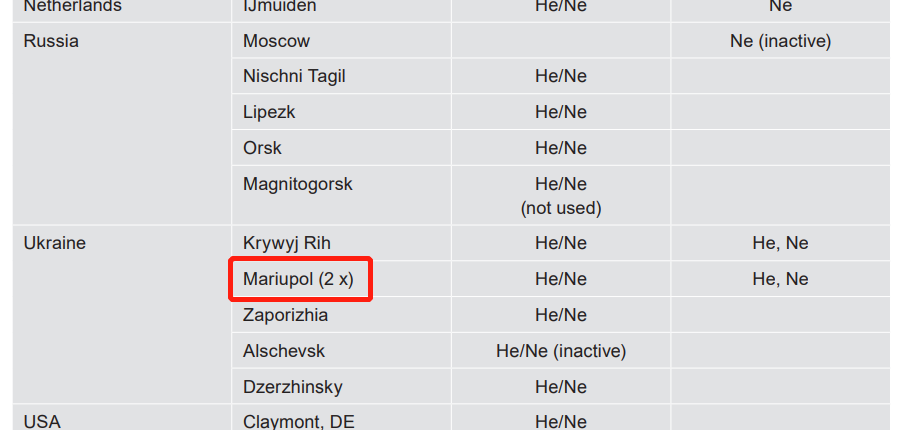 从产业链上看,由于前述历史原因,氖气的空分和纯化产能高度集中于俄乌两国,尤其是乌克兰的东南部钢铁工业带,随着冲突持续,该国三家主要氖气供应商Ingas、Cryoin、Iceblick正常生产已受到严重影响,部分重要基地如马里乌波尔钢铁厂甚至已沦为核心战场,而这三家公司的产量,占到全球氖气供应量的相当大比例。