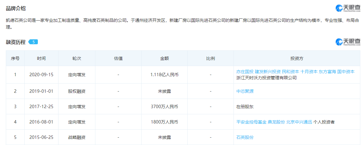 据天眼查显示,2015年至2020年,凯德石英经历了多轮融资,投资方包括亦庄国投、建发新兴投资、民和资本、十月资本、东方富海、国中资本、中芯聚源、石英股份等。(校对/Arden)