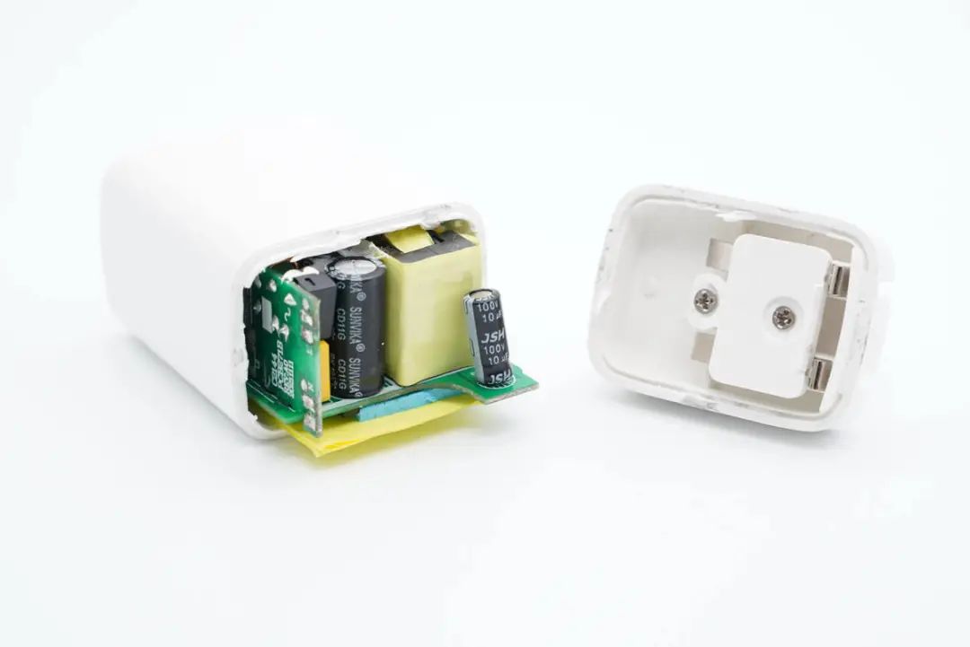 沿插脚侧外壳接缝拆开充电器,交流输入通过弹片与电路板压接供电。