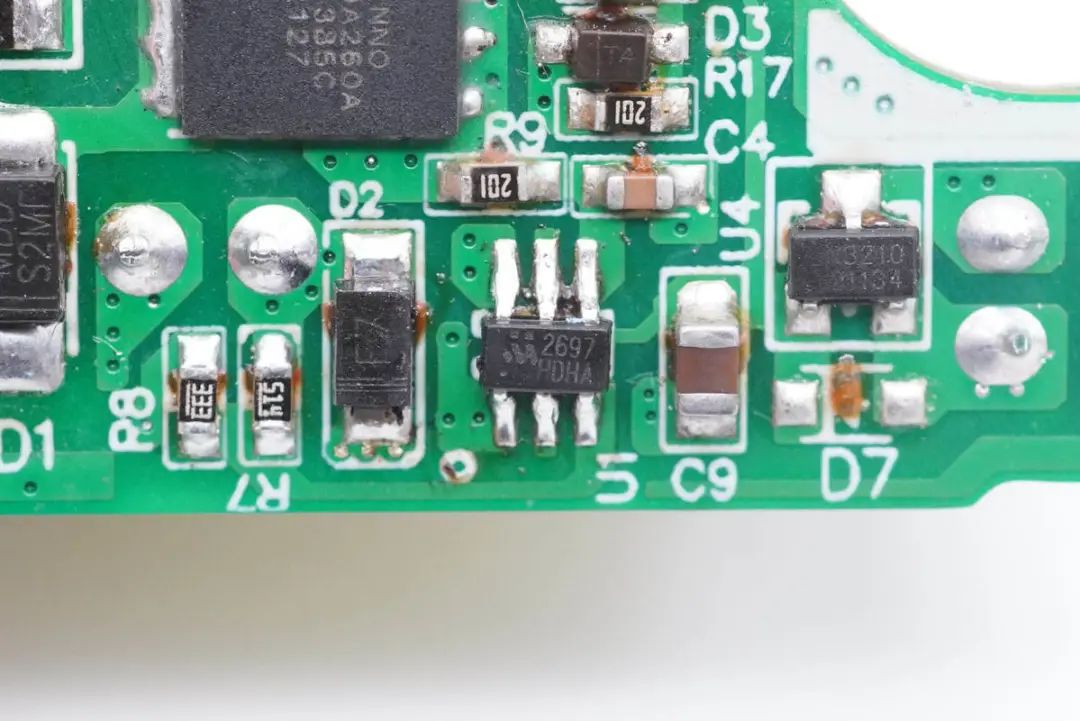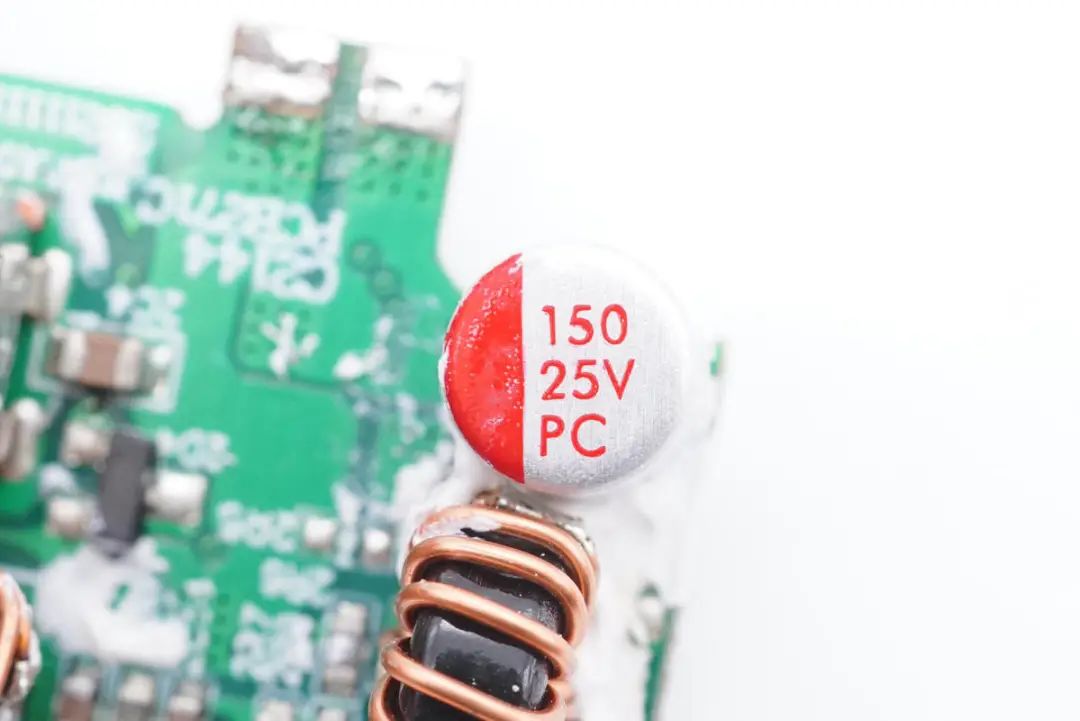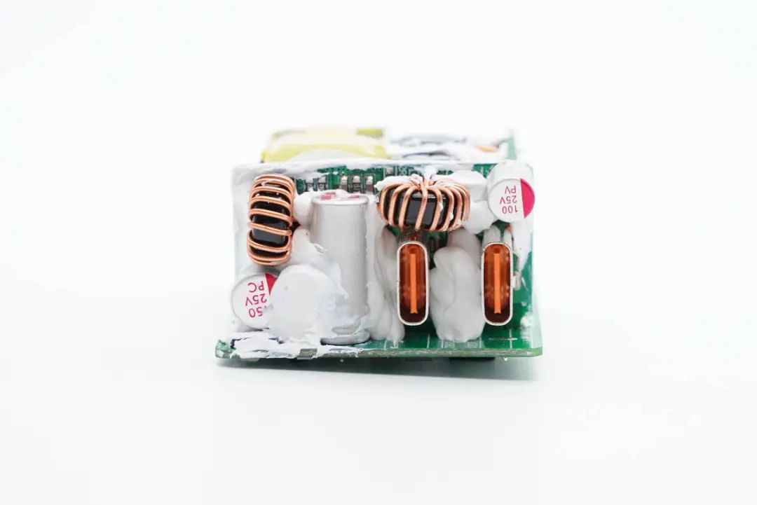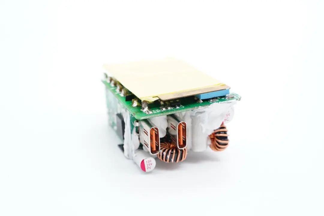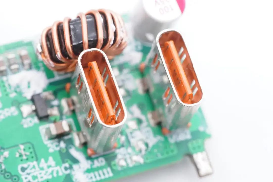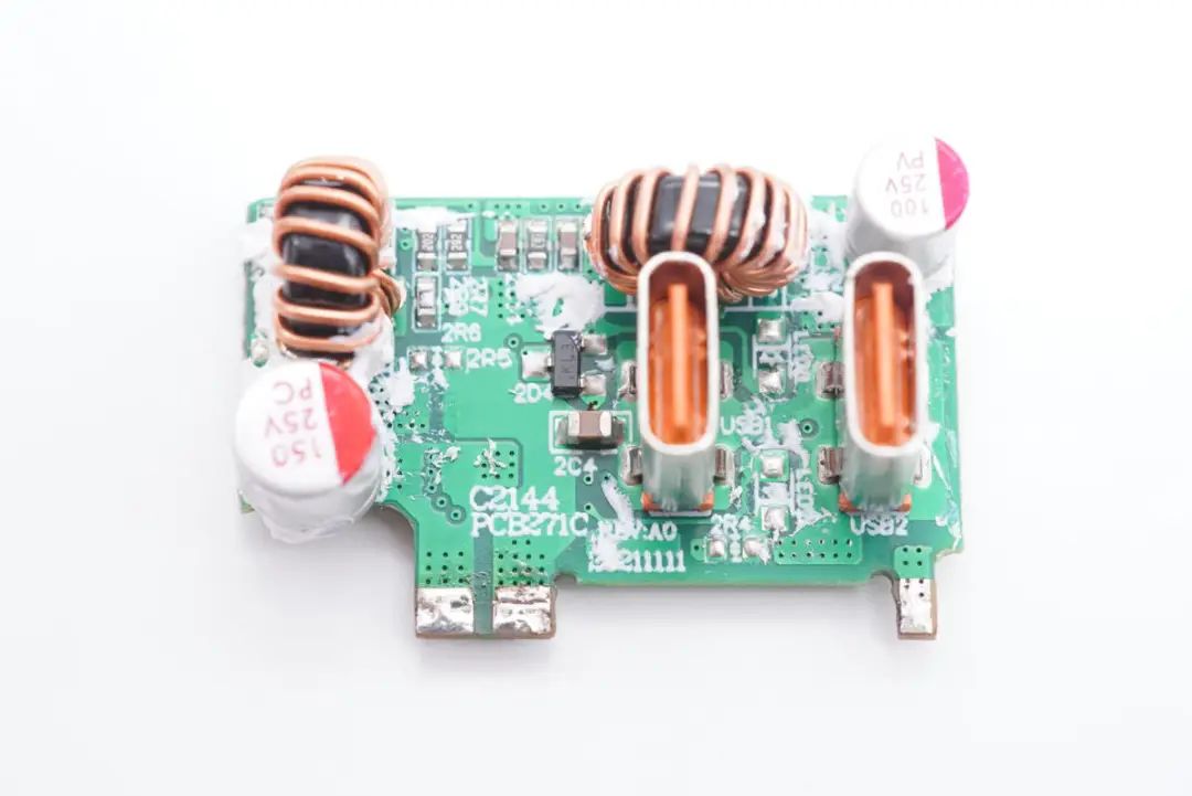 小板上焊接两颗磁环电感,两颗固态电容,分别对应两路独立的快充输出。