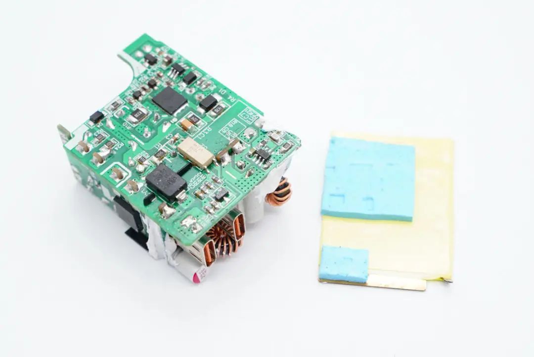 导热垫对应氮化镓开关管和同步整流控制器的位置。