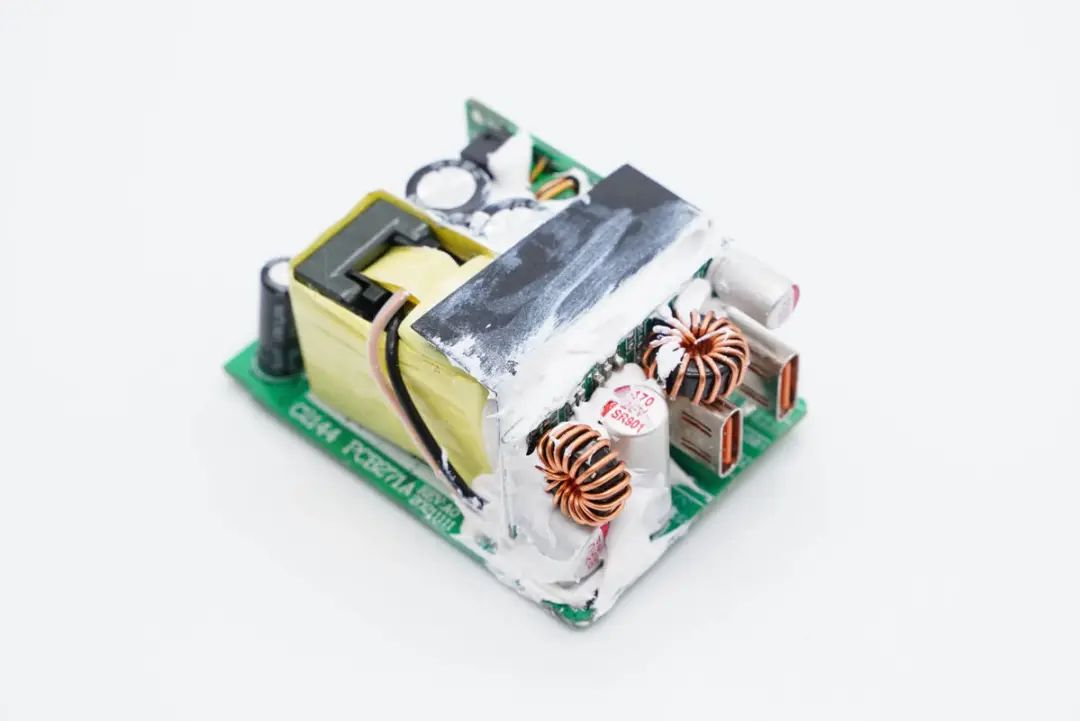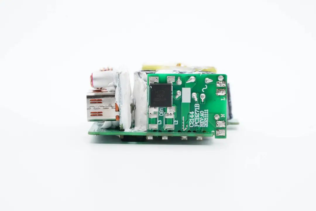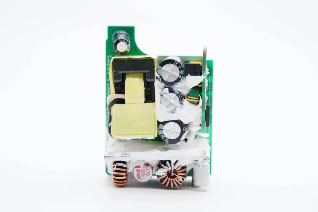 PCB板正面一览,右侧垂直焊接小板为输入整流和滤波电路,中间是初级滤波电容,最左侧是开关变压器。下面焊接的小板为二次降压电路,焊接降压电感和USB-C母座。