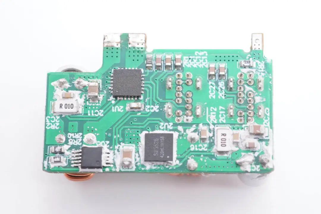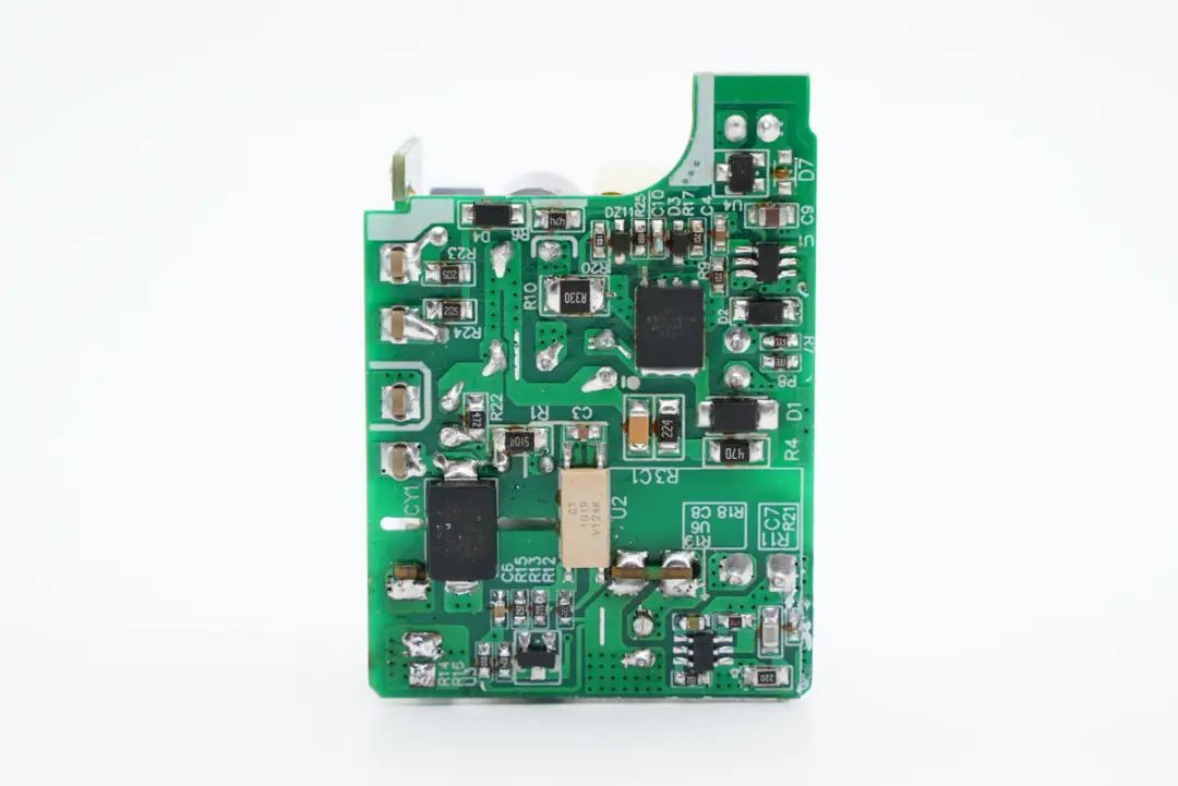 PCB板背面一览,焊接氮化镓功率器件和QR反激控制器,光耦和贴片Y电容,次级侧焊接同步整流控制器。