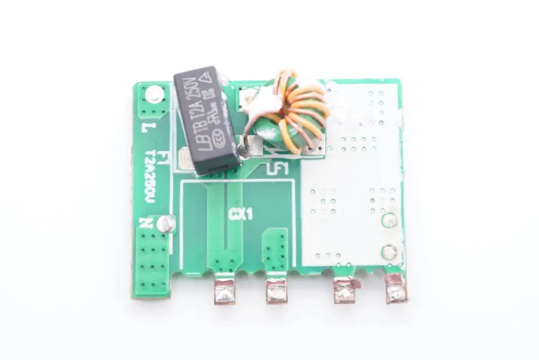 输入端一览,连接插脚取电的小板上焊接EMI滤波器件和保险丝。