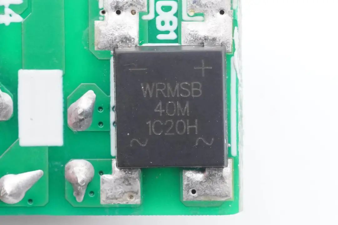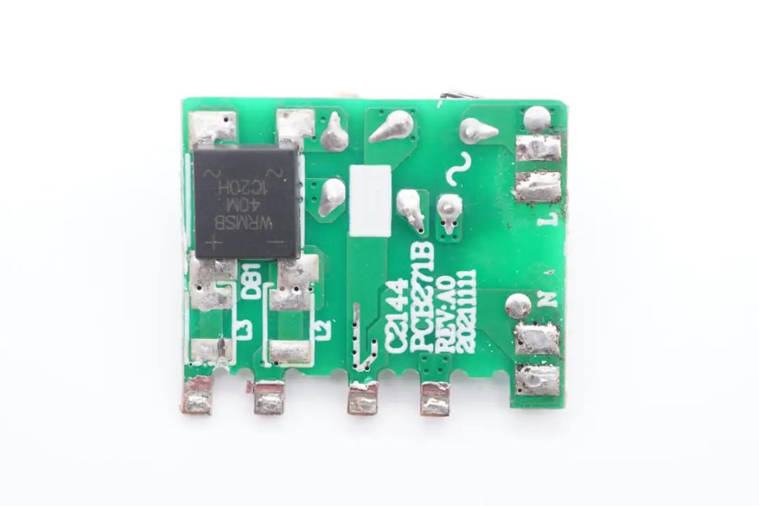小板背面焊接一颗整流桥,右侧为连接交流输入的触点。