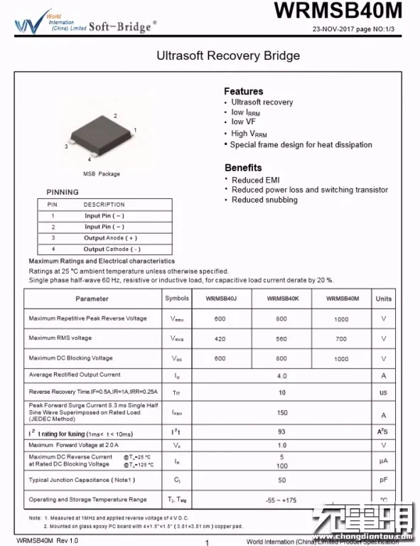 经过EMI电路过滤后,由沃尔德WRMSB40M整流桥将交流电转换为脉动直流电。这颗软桥通过较软的恢复曲线,比较平滑的关断特性,可以降低二极管结电容达到非常少的谐波振荡产生的效果。