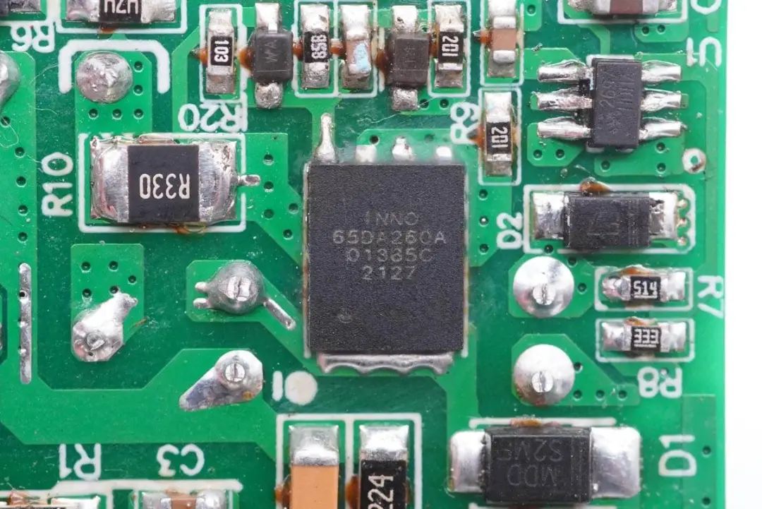 氮化镓开关管采用英诺赛科INN650DA260A,这是一颗高性价比、耐压650V的氮化镓高压单管,瞬态耐压750V,得益于工艺改进,相比英诺赛科之前的氮化镓器件,性能有明显的提升,适用于65-120W的反激架构,120-200W的LLC架构。