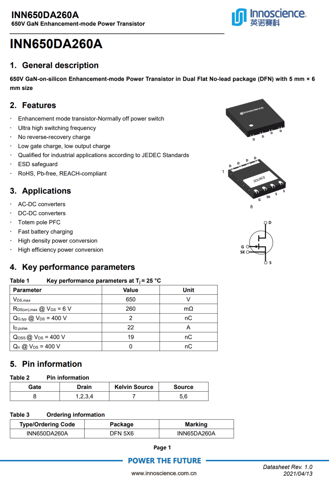 INN650DA260A支持超高开关频率,无反向恢复电荷,具有极低的栅极电荷和输出电荷,符合JEDEC标准的工业应用要求,内置ESD保护,符合RoHS、无铅、欧盟REACH法规。