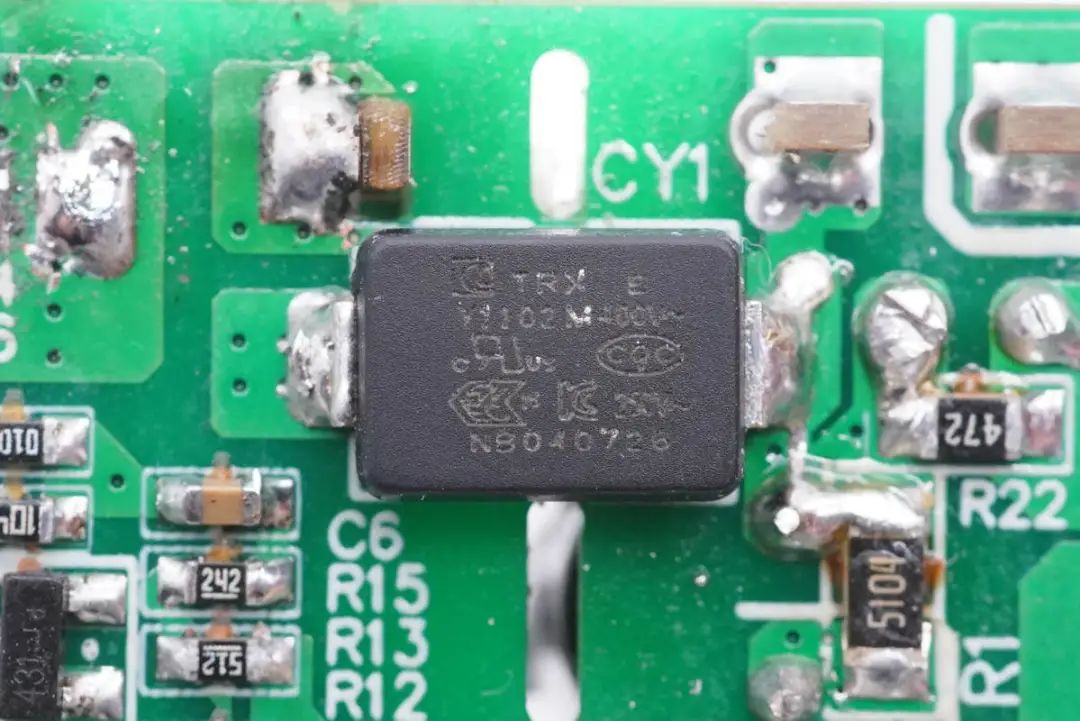 通过对PCB的观察发现,这款充电器采用QR开关电源架构设计,输出固定电压,再由两路独立的协议降压芯片控制接口输出电压。下面我们开始从输入端了解各个器件。