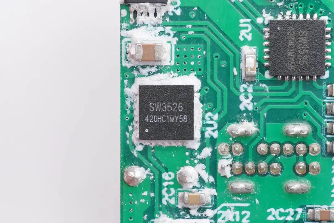 充电头网通过拆解了解到,充电器内部采用茂睿芯氮化镓主控芯片搭配英诺赛科氮化镓功率管,输出使用MPS同步整流控制器,定压输出。输出使用两路智融SW3526多合一降压芯片,芯片内集成降压MOS管,同步降压控制器以及协议功能,大大简化次级二次降压电路设计。