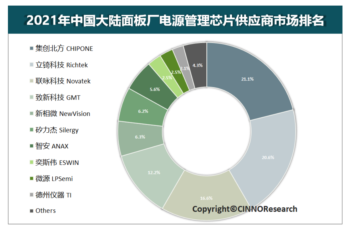 图1:2021年中国大陆面板厂电源管理芯片供应商市场排名,来源:CINNO Research