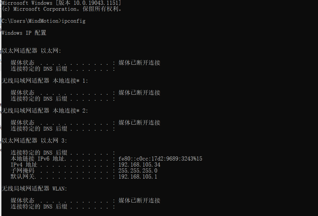 到这里已经完成了工程的创建,但是还有一步比较重要的,配置我们的IP,将数据发送给服务器端,则需要知道服务器的地址。打开命令行窗口输入:ipconfig