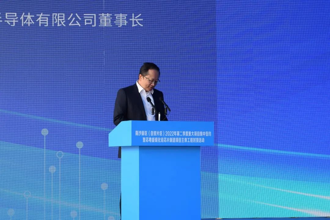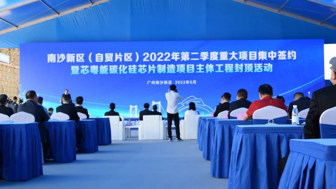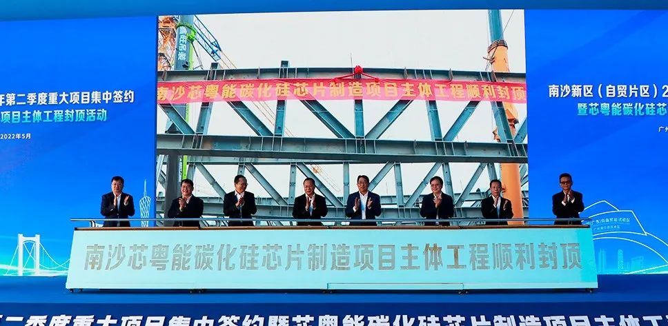 5月17日上午,南沙新区2022年第二季度重大项目集中签约暨广东芯粤能碳化硅芯片制造项目主体工程封顶活动隆重举行,广州市委常委南沙区委书记卢一先,南沙区委副书记南沙区人民政府区长董可、芯粤能半导体董事长肖国伟、广东省集成电路行业协会会长粤芯半导体总裁陈卫、芯粤能半导体总裁徐伟、中建一局华南分局局长宋宝传出席仪式。