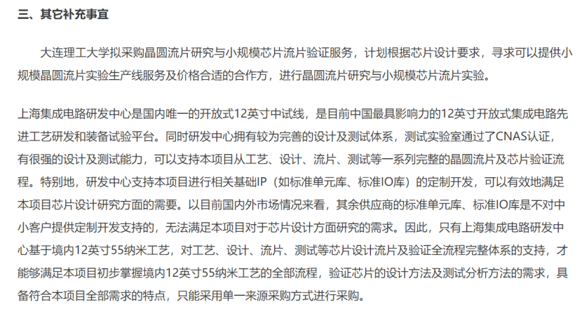 公告指出,上海集成电路研发中心是国内唯一的开放式12英寸中试线,是目前中国最具影响力的12英寸开放式集成电路先进工艺研发和装备试验平台。同时研发中心拥有较为完善的设计及测试体系,测试实验室通过了CNAS认证,有很强的设计及测试能力,可以支持本项目从工艺、设计、流片、测试等一系列完整的晶圆流片及芯片验证流程。特别地,研发中心支持本项目进行相关基础IP(如标准单元库、标准IO库)的定制开发,可以有效地满足本项目芯片设计研究方面的需要。