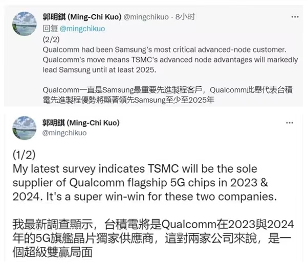 郭明錤在社交媒体上也表示,高通2023及2024年的5G旗舰芯片由台积电独家供应,对两家公司将是超级双赢的局面,高通此举意味着台积电制程工艺对三星的领先优势将至少持续到2025年。(校对/木棉)