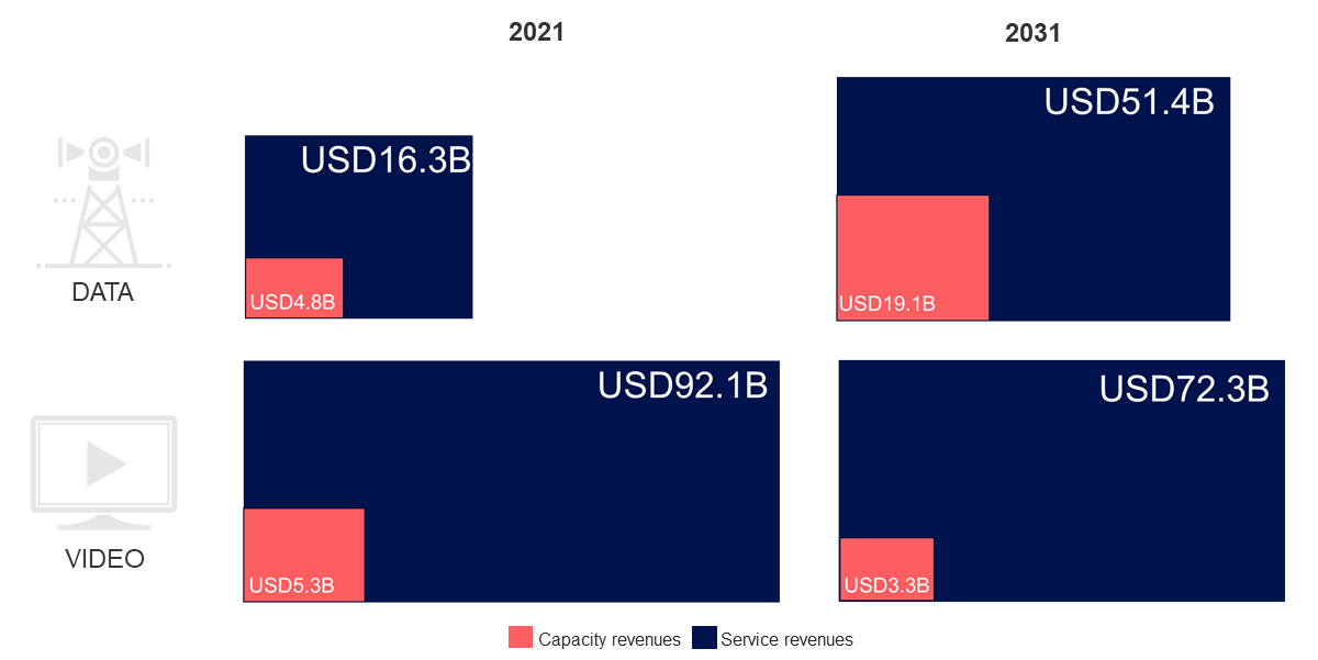 在卫星服务收入方面,Euroconsult同样预计在2031年前将看到市场爆发式增长,累积规模有望达到1.2万亿美元,其中数据类应用所占份额将从目前15%,提高到2031年的42%,与数据服务收入激增相反,来自卫星电视等视频服务的收入将呈现下降趋势,预计到2031年卫星收视用户将流失2600万户,8500个卫星电视频道将面临关闭。