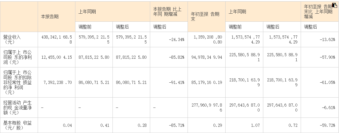 其中,第三季度实现营收4.38亿元,同比下降24.34%,归属于上市公司股东净利润0.12亿元,同比下降85.82%,扣除非经常性损益净利润0.07亿元,同比下降91.41%。