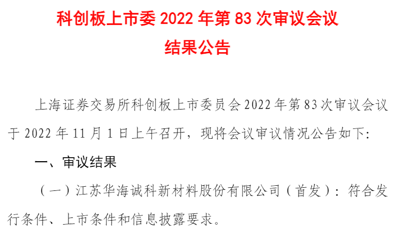 11月1日,据科创板上市委2022年第83次审议会议结果显示,江苏华海诚科新材料股份有限公司(简称:华海诚科)科创板IPO成功过会。